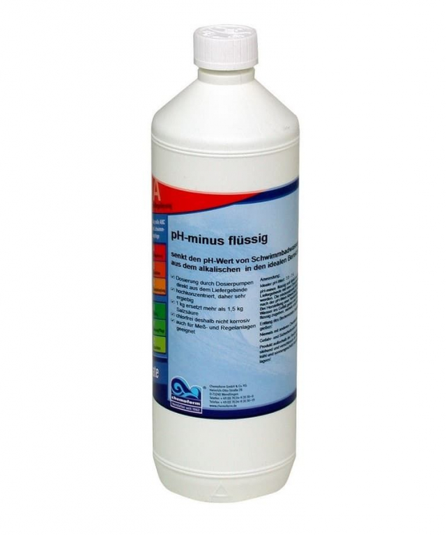 Препарат pH-Mинус жидкий для понижения и регулировки уровня pH в воде плавательных бассейнов. Простот в использовании: полностью растворяется в воде, не выделяет вредных паров и предотвращает коррозию металлов.
